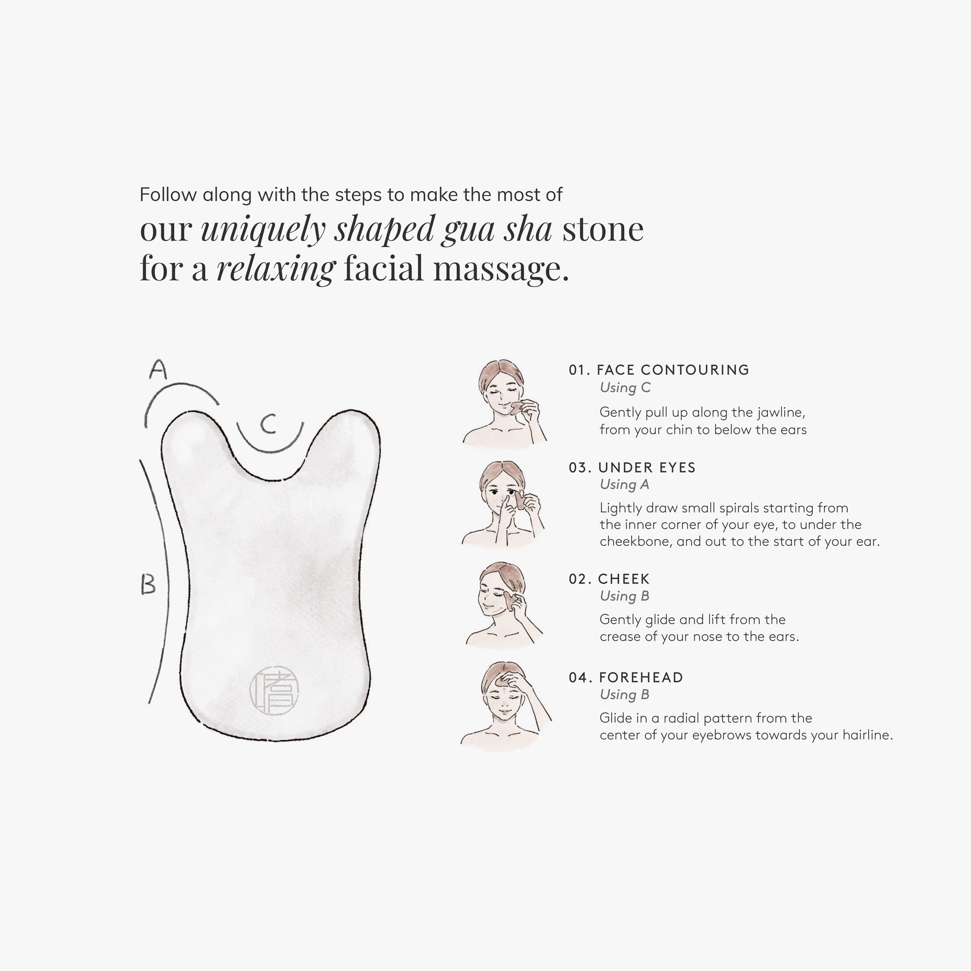 Prep skin with your favorite face oil or moisturizer. Use our easy-to-use Gua Sha Gesture Guide and follow along with the instructions.