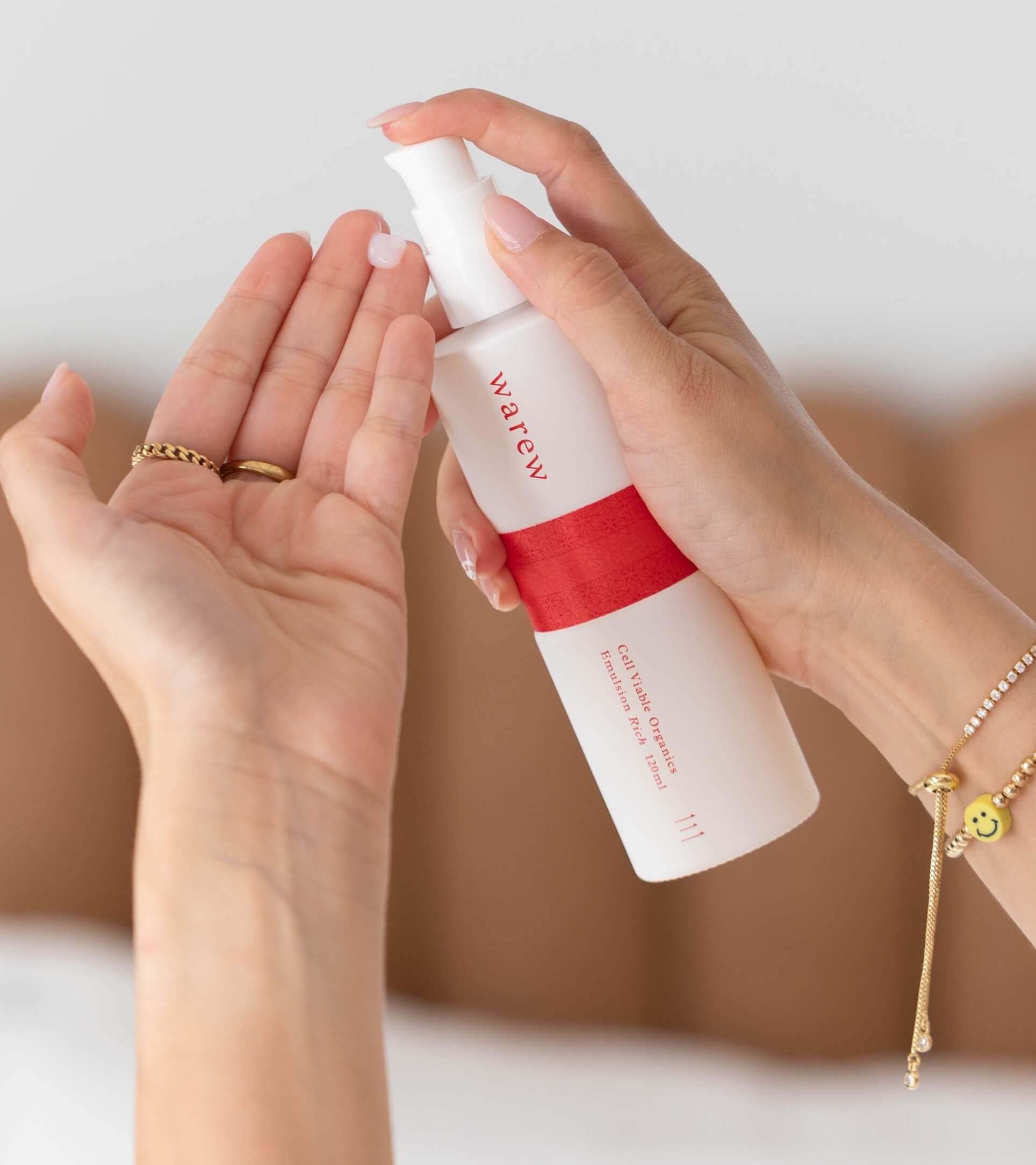 - Take four to five pumps onto your dry palm. Warm product in hands before applying.